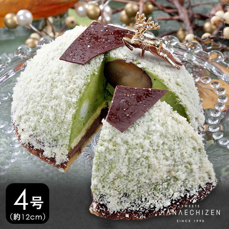 福井の曹洞宗大本山 永平寺の僧侶が被る笠をイメージしてお作りした抹茶のケーキです。上品な味わいの抹茶チョコムースと丸ごとの栗とふわふわの羽二重餅、チョコレートの味わいをお楽しみください。