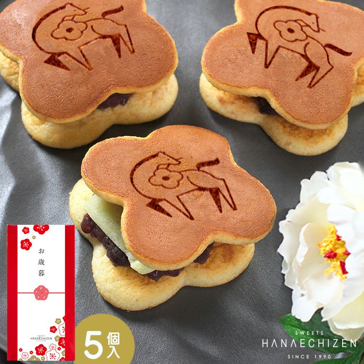 幸運の四つ葉のクローバーのカタチのどら焼きに羽二重バター餅と粒あんを挟みました。縁起の良い干支どら焼きです。