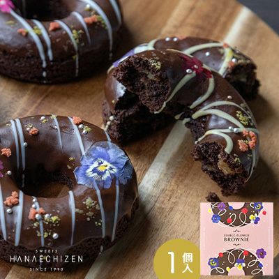 しっとりブラウニーにほろ苦いキャラメルクリーム入り。チョコレートとエディブルフラワーで丁寧にデコレーションしました。
