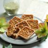 最中フロランタン「ソバランティーヌ」は、たっぷりの越前ソバの実にアーモンドを加え、米あめを使用したキャラメルは優しくどこか懐かしく香ばしい甘さ。最中のサクサク感と相まって、とびきり軽快な食感です。最中皮には越前と名所丸岡城の型取りが入っています。