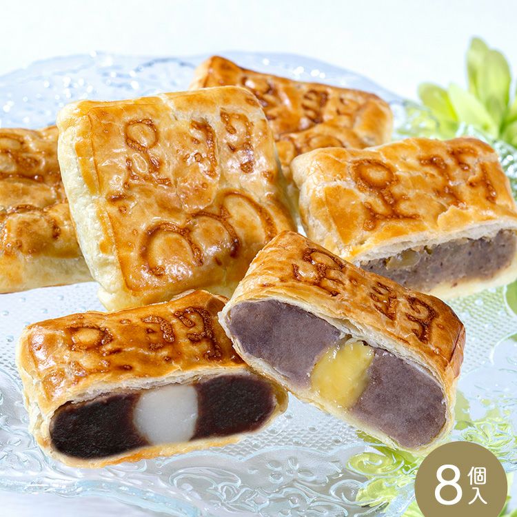 オープン当初より1番人気の和洋折衷パイまんじゅう「足羽三山」。福井市民に愛される足羽山・八幡山・兎越山の3つの山を足羽三山といい、それをモチーフに「足羽三山」が誕生しました。144層からなる折パイ生地で北海道十勝産の皮むき小豆あんとカスタードを包んだ「小豆」、新商品の黒糖あんに福井県産ブランド米いちほまれの餅入「黒糖」の2種類入りです。