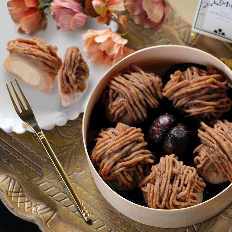 ベースには、ジャパンフードセレクションでグランプリ受賞した「Cream BonBon(モンブラン)」を使用。とろけるような柔らかさの生クリームと栗餡を、羽二重餅で包み込んだ生大福。その上には、和栗のペーストをたっぷりと絞り、中央に花芯をイメージした栗の甘露煮を飾りました。