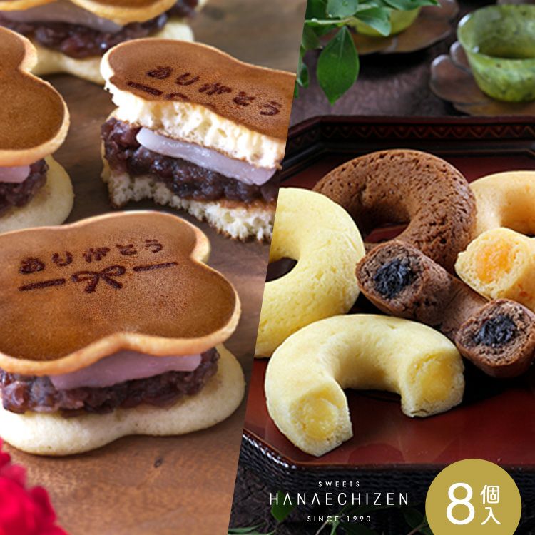 ありがとうの焼印を押した四つ葉のクローバーのカタチのどら焼きの皮で、羽二重バター餅と粒あんをサンドした「ありがとうどら焼き」と福井市中央に位置する足羽三山にかかる大きな丸い月をイメージした蒸しドーナツ「足羽の月」をセットにしました。