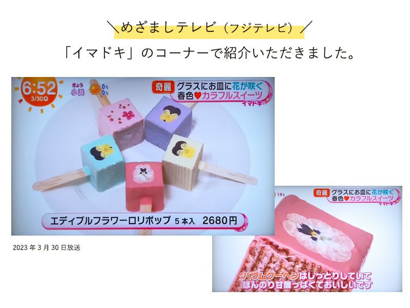 他の画像を見る めざましテレビで紹介されました 【送料別】エディブルフラワーロリポップ 1本入(5本セット/10本セット) クール便でお届け 価格 ¥ 2,500 税込 〜 価格 ¥ 税込 在庫切れ 詳細を見る お気に入りに登録する