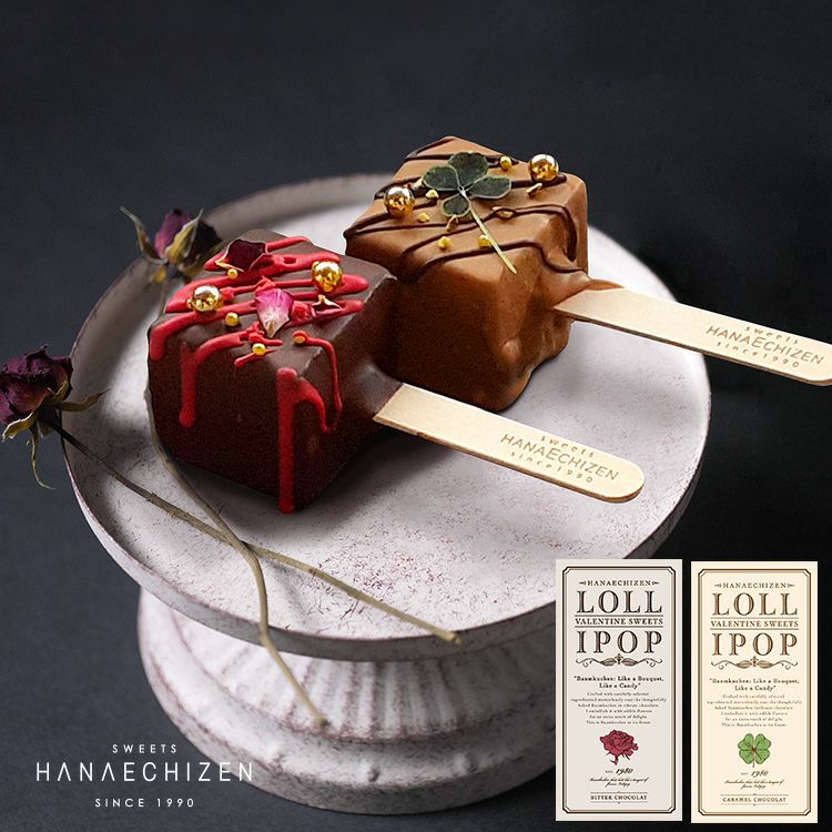 ショコラとキャラメルの2種類。しっとり焼き上げたしあわせスイーツバウムクーヘン。ショコラにはローズを、キャラメルには四葉のクローバーを飾りました。