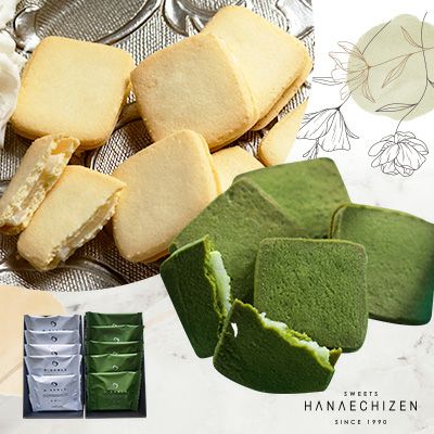 福井名産やわらか羽二重餅とまろやかなホワイトチョコをさくさくのサブレでサンドした羽二重サブレ、福井名産やわらか羽二重餅とほろ苦な宇治抹茶チョコをバターたっぷり抹茶サブレでサンドした羽二重サブレ抹茶をセットで。