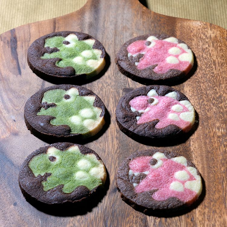可愛い恐竜クッキーは、さくさくの食感で、ココア×抹茶のグリーンダイナソーとココア×苺のピンクダイナソーの2種類。